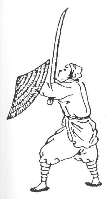 You sound very certain that this is Vietnamese and not Chinese. Do you know how to tell the two apart? Are you using a source other than the Barbier-Mueller book or the Huard and Durand book? Honestly, up until now, I had thought the two shield designs to be identical. But, if you can distinguish them by weaving pattern or some other way, I REALLY want to know. I collect Vietnamese arms myself, and such information would be invaluable to me. Just to give you an idea of my problem, I'm attaching a line drawing from the Chinese military manual, LIEN PING SHIH CHI, written and illustrated in 1571 (and reproduced in Osprey Military's, MEN-AT-ARMS SERIES, LATE IMPERIAL CHINESE ARMIES, 1520-1840). As you can see, it looks just like Bill's shield, or for that matter, any other large, round rattan shield. Anyway, I hope you can help. |