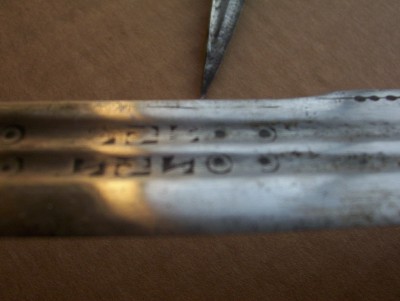 Are these the only markings on the blade? The pictures are not too god I am afraid, could you take some better? Where exactly are these markings? I think I know, but I would like to be sure, and I am not sure I can help you, but let us see with some better pictures, and a close up of the hilt as well. Any markings on the hilt? |