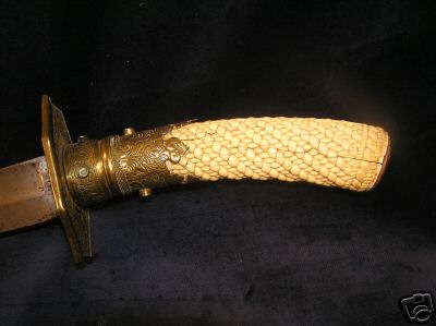 Overall length in scabbard: 37 inches. Overall length out of scabbard: 34 inches. Length of blade: 27.5 inches. Width of spine at the forte: 5/16 inches. The blade is obviously European with a lot of etching of decorative curlicues and whatnot. There appears to be a picture of drums and a banner. The letter “W” is stamped on the spine. I suspect that the blade is French, but I can’t find anything particularly French in the décor (such as French writing, a depiction of a French flag, etc.). This isn’t my area at all, so if anyone can contribute anything, I’d appreciate it. The scabbard is metal and painted black…also European. But the throat, chape, and suspension mount are all brass and decorated with what appear to be typically Vietnamese motifs (dragons on the throat and chape). The guard is an elongated octagon, also decorated with dragons, and a long ferrule covers the first third of the handle, studded with five settings with stones. Two stones are black, two are clear, and one is missing. They are flush with the settings, and they may be glass. The handle is a single piece of elephant ivory, very beautifully carved with a textured pattern. There is a stone on the pommel, which appears to be a replacement (in fact, it came off in transit). I would expect that this once had a brass cap that matched the other fittings. I present all of my ideas of Vietnamese origin with a grain of salt. While the motifs of the fittings certainly APPEAR to be Vietnamese, the overall suite doesn’t exactly match anything I’ve seen before. The octagonal guard is odd, and the European blade is almost unheard of. Carved handles are common on the nicer kiem and guom, but I’ve never seen one without the longevity symbol (shou) carved into it. Of course, if this was intended for a French officer, this may explain the lack of the shou, or any other of the Buddhist iconography that is so common on Vietnamese arms. The short of it is, if anyone has any other ideas, I’d love to hear them. Thanks. |