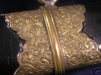 I can use some opinions on a new purchase I made last week. I believe it is a European blade and scabbard that has been dressed up in Vietnamese mounts (I apologize for using the dealer’s photos…I don’t have access to a digital camera at the moment). I suspect this once belonged to a French officer who was stationed in Indochina in the 19th century and had his weapon redressed locally for whatever reason.