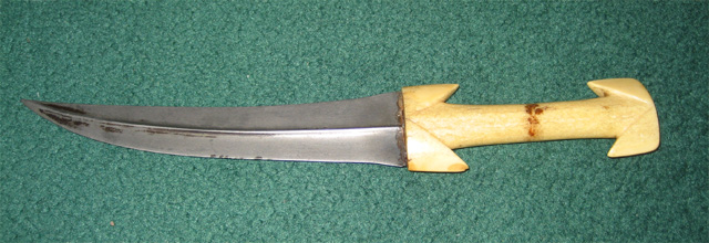 I recently bought this nice Albanian Jambiya at a local gun/knife show. I wanted one of these for a while and is now my favorite pice in my collection! It is good quality with a nice walrus ivory hilt and good blade. I was told by the person I bought it from said it might be watered steel but it is too darkend by age to tell. Should I clean it up and see if it is watered steel? How would I go about doing that? It is about 14" overall with a 8 1/2" blade and a 5" hilt. It had a small crack in one side of the hilt that I needed to repair with glue but other than that it is very sturdy with no loosness in the blade and the hilt is in good condition exept for the already mentioned crack. I think it is probaly 19th century, could anyone pin it down a little better? All comments are welcome!
