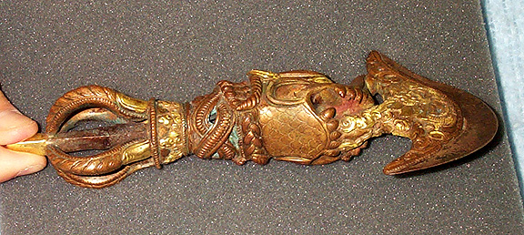 by Radu Transylvanicus Very few things coming from the region of the High Himalayas like Sikkim, Bhutan, Nepal and Tibet cannot be instantly recognized as very distinct if not unique in the historical and artistic patrimonies of the world. We acknowledge with almost no exception that every artifact produced in this side of the world carries a direct deeply symbolical and spiritual connotation and martial tools are no exception but rather the embodiment of this certitude. Due to its extreme natural surrounding and geography the need for war or defense was minimal here but not inexistent, caught in between the vast and millenary Hindustani and Chinese empires. This most exquisite blend where ancient Buddhism of India meets the deeply philosophical religions of China and mixes further with ancient local shamanistic practices producing a spectacular spirituality in everyday life of which a product of this combination I found in the two daggers I am proposing you for debate today: the PHURBA and the KARTIKA. I should start by saying that I do not posses an exhaustive knowledge of neither and noe am I intending to pose as scholar but only I hope that I lit a spark in some of you that will bring something to the round table and share knowledge and theories regarding this subject : The Spiritual Daggers of the High Himalayas : Phurba and Kartika . I suggest from the start to let us dissociate for the moment as much as possible, unless direct in connotation, from other edged weapons from the area like the Kora, Ram Dao, Khukri or Sosun Pattah which are wonderful arms by all means but with perhaps at times Kora have no deep spiritual symbolism or claim esoteric powers. I should probably start by describing and identifying them for those of us who are less familiar with them and hope that perhaps images would speak deeper than words for the moment: KARTIKA (also known as Drigug , Grigug, Dhorje ) is essentially a knife with a crescent moon blade and a stamp shaft, to a little extent reminding of an Alaskan Ulu knife (possible correlation with the eastward migrations of the Asian hunters and gatherers communities over Bering Strait resulting ultimately in Eskimo and American Native races birth, who knows...). The word Kartrika/Kartika in Sanskrit means ,,chopper,, which is exactly the manner one would expect its mechanics to work, it very much seems to have evolved from a utilitarian hunter’s knife considering the large skinning rounded broad blade and the omnipresent gutting hook. Last edited by Radu Transylvanicus; 7th December 2004 at 12:35 PM. |