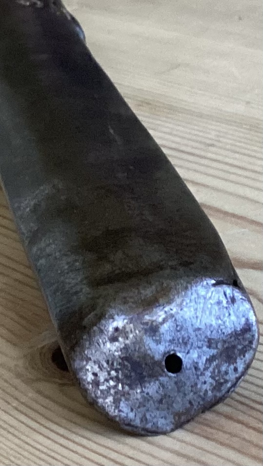 Some more photos. The edge is sharp with the ‘ricasso’ on one side possibly due to sharpening that one side more than the other. There is a drain hole on the bottom of the scabbard and signs of copper brazing on the hilt and scabbard. I would appreciate your further ideas on age and origin. Thanks again.