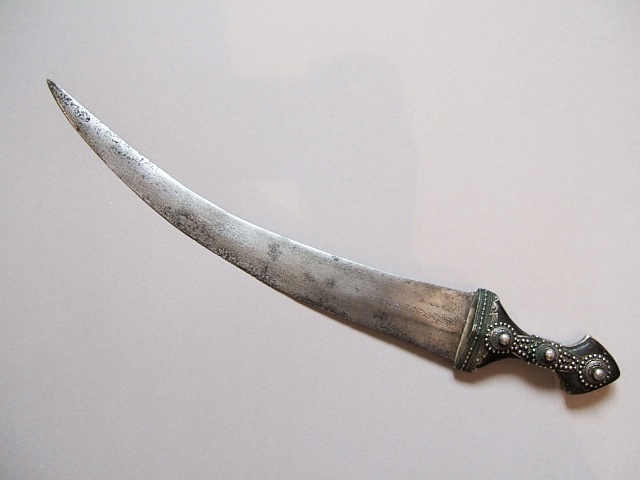 Picked this up today in trade. Early 20th century jambiya with nice silver fittings over horn came with old stud decorated scabbard with belt. The blade is in decent shape but it looks as if it has seen plenty of action. Please forgive the one shaky picture.