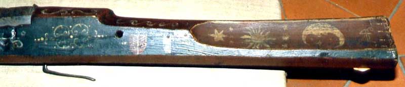 What in interesting is the cabalistic symbols seen painted on, the sun, moon and stars. These are very similar to the talismanic blades which often are seen on German sword blades of the 18th century after becoming popular on hunting sword blades earlier. Are such symbols known to appear on the stocks of these early guns in other cases? Also, I am still curious about the choice for red and green coloring. All the best, Jim |