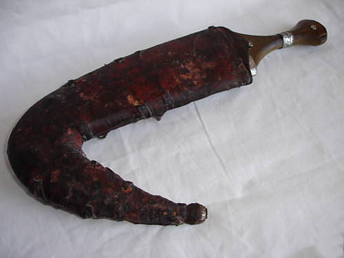 I would like to have some information about this jambiya. Could any of you give me some idea as to possible age, origin, a fake (tourist piece)….or authentic? is this silver in the scabbard?