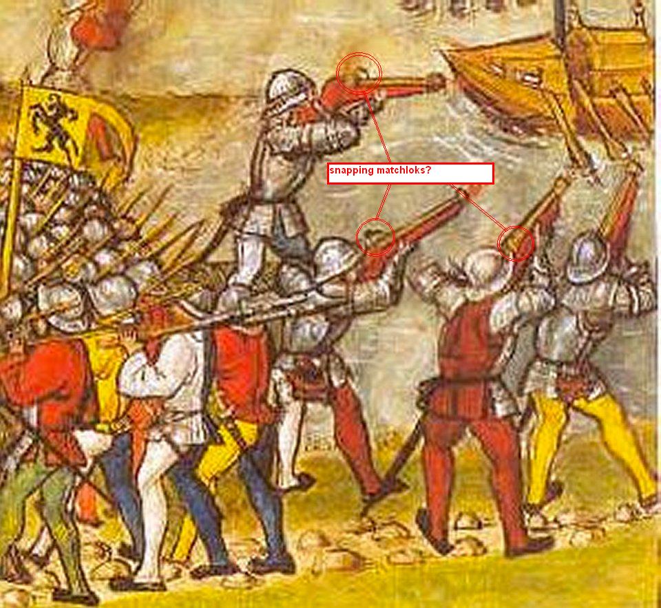 2. The arquebuses illustrated in Diebold Schilling's Lucerne Chronicle of 1513 are ignited clearly by means of a snap tinder lock (tinder is a kind of fungus growing on trees and was lighted by the smoldering matchcord) but no details are shown.