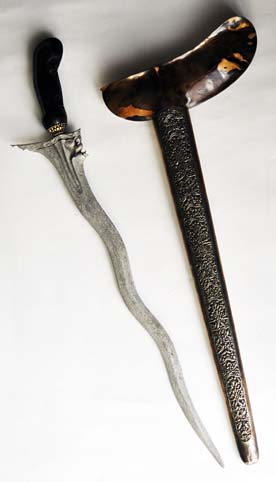 How well does the blade fit to the Madura scabbard? I'm tempted to agree with Henk's assessment that this blade is possibly a recent keris-like object (KLO) either produced for those travelling for pleasure or maybe as cheap props for wedding ceremonies. AFAIK there are quite a few current centers/smiths throughout Sumatra and the Malay Peninsula and most also cater to the tourist market. The Medan area seems to be a good example with bladesmiths as well as silverworking and carving specialists getting better at imitating genuine pieces aiming at the serious collector market; low-end KLOs keep being mass-produced for tourists, too. Other areas also produce tourist pieces with qualities ranging from decent to abysmal; usually, tools (fieldwork, kitchen, etc.) as well as genuine ethnographic pieces (often of village quality) are also offered for the local market - these seem to quite rarely find their way into the western world though. Then there are Indonesian smiths catering to the global market for utility blades, ethnographic repros, custom knifes, and fantasy blades... Regards, Kai Last edited by kai; 26th June 2009 at 02:08 AM. |