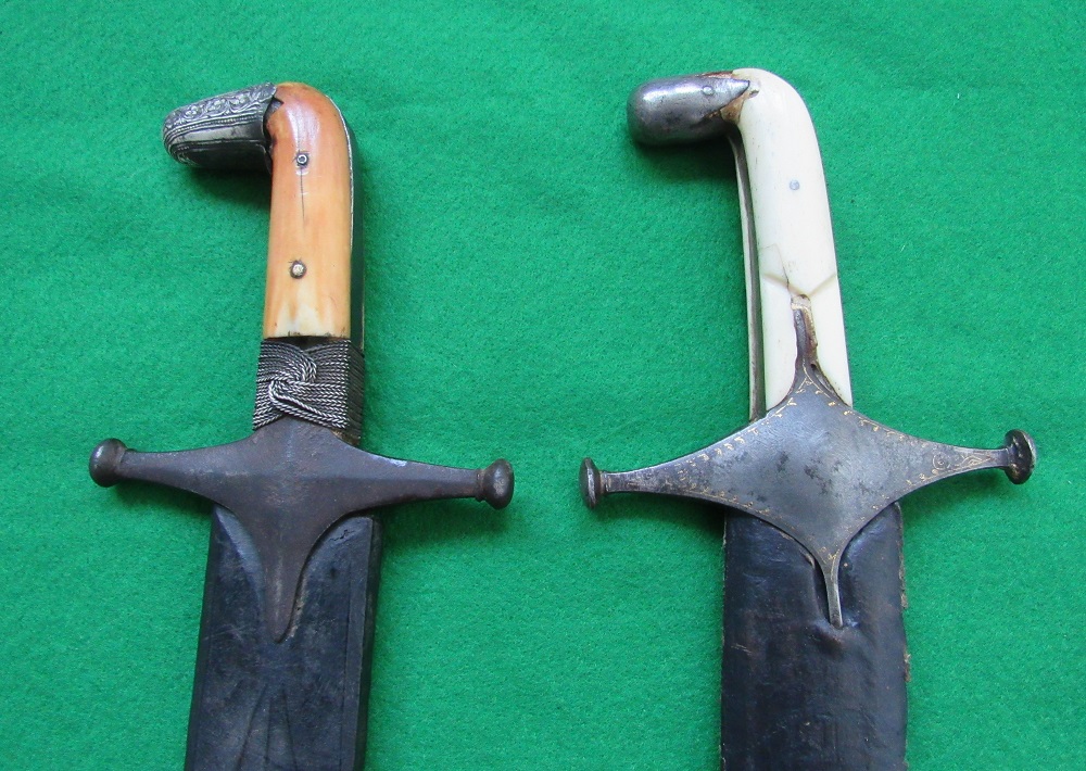 Those two examples are interesting to me due to their unusual features such as the lockets which borrow from other styles. The first borrows from Arab swords usually found further north and one is closer to the usual baluch example. Note that the sword photographed next to the baluch example has poorly made editions and its pommel was likely identical to the typical Omani examples. |