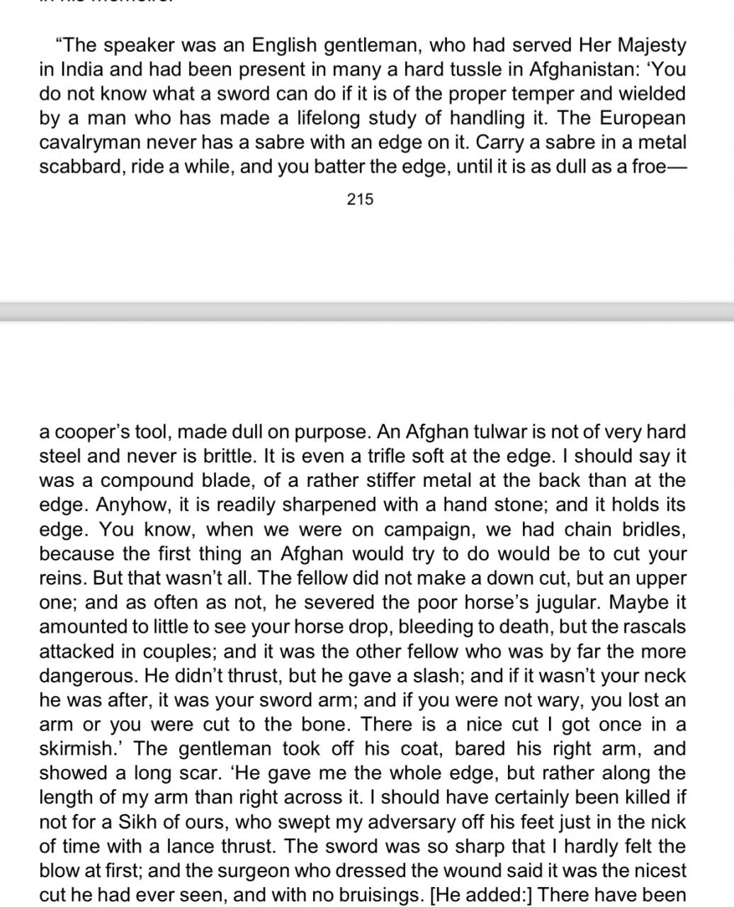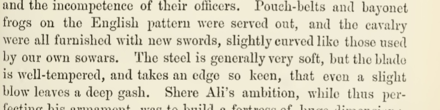 For what it’s worth I have seen Indian blades described by British as brittle, yet here the speaker explicitly states that Afghan blades were not brittle, though rather soft. It seems extolling the Deadliness of the blade and describing the blade as rather soft are common in these British descriptions of Afghan blades.