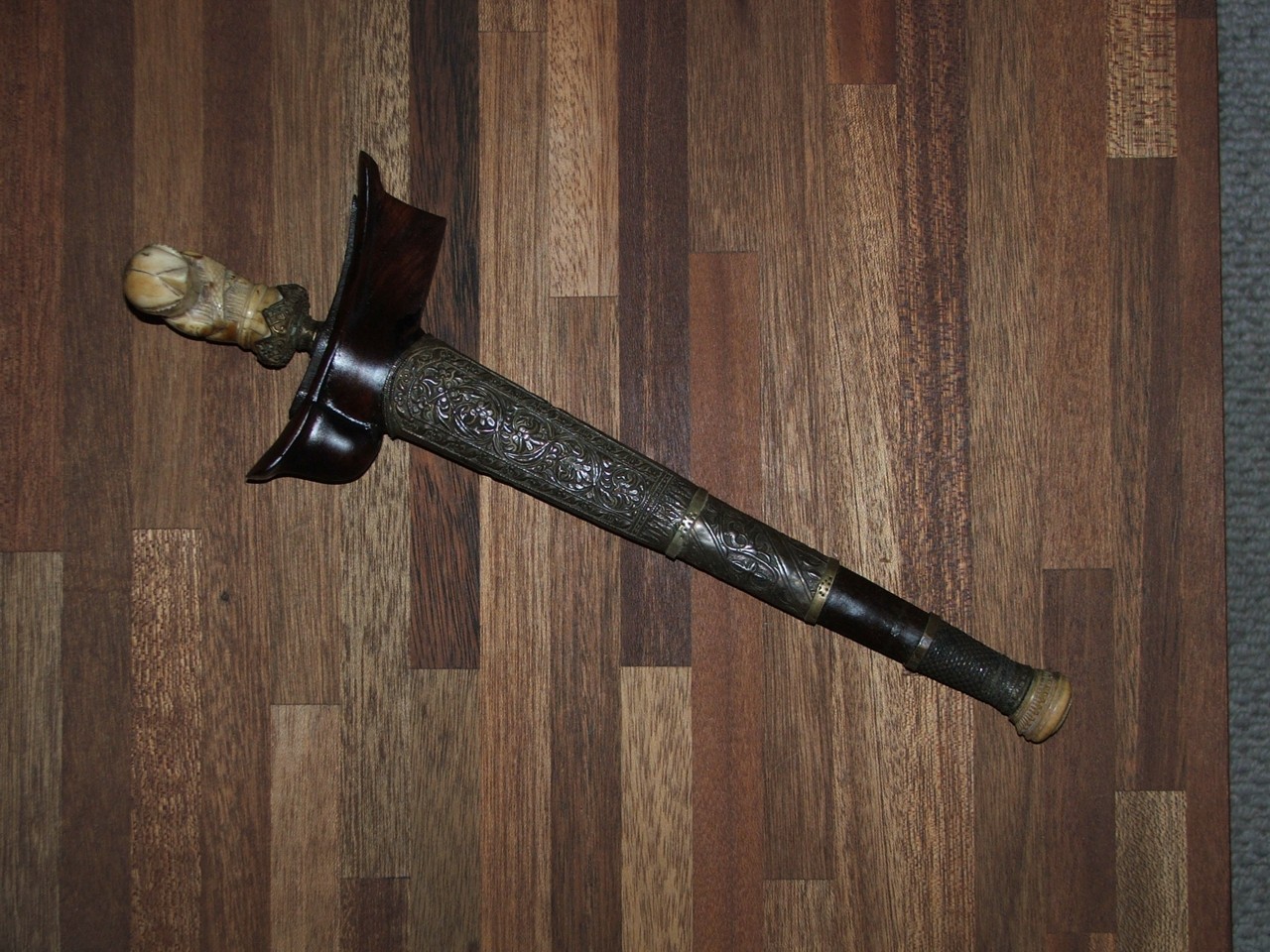 "entire" was not the best word for me to use, & my phrasing was imprecise. I'm not quite sure that I have a single word in English that I can use. I did go into a bit more detail in my later post, #9, where I use the English word “blade”to refer to the keris --- to the Javanese people, only the blade is the keris, all other parts are just dress, but when the keris, ie, the blade, is combined with all those other parts, it becomes a complete entity, expressing a multitude of symbols & ideas. As a complete entity it can be referred to as a “keris”, but again, that depends upon the level of language being used & the situation. But we’re using English. Unless we are using Javanese , or perhaps one of the other languages that are used by people belonging to keris bearing societies, then we are limited in how we can refer to a keris & its parts, so if we look at a keris with the blade still in the scabbard, we refer to what we see as a keris, if we look at the keris out of the scabbard & with hilt attached what we see is still a keris. So, if I look at this keris as a complete entity comprised of scabbard, hilt, hilt cup, blade, then what I see is a keris of the Bugis people, a cultural classification, not a geographic classification. Once we put any blade at all into the dress items that are identifiable as belonging to a particular culture, society, or region, then we refer to that keris according to what we can see, we do not recognise the identity of the blade until it has been removed and independently addressed. In my post #9 I did independently address the blade:- “The blade certainly appears to be outside Jawa, but it could possibly be from one of the areas not under direct kraton influence, however, I'm still inclined to go with what I believe would be the opinion of my teachers:- "diluarJawa" & thus not even worthy of consideration---” the opinion of my teachers, not of myself. In recent years there have been several books published on Bugis keris, but it seems to me that if these books represent the sum total of knowledge on geographic origin of blades dressed as Bugis keris, & regarded as Bugis keris, by Bugis people, then there is quite a way to go before we can confidently name the geographic point of origin of the blade used in a Bugis keris when we consider the entirety of a Bugis keris. There are good, solid reasons that with Javanese keris we have a very deep well of knowledge & belief, and for other keris bearing societies we have a well of knowledge that is in many cases dry, or almost so. I do not wish to address this problem. To summarise:- in my opinion, this keris in its entirety is a keris of the Bugis people, I am not able to defend an opinion that might place the geographic origin of the blade of this complete keris in any specific geographic location. Further, based upon my own field research & my own experience, I am not prepared to name with confidence the geographic locations that contributed the parts other than the blade to this keris as a complete entity. Any opinion I might express in respect of this keris is based upon the opinions of other people. To compress this into a few words:- I do not know. |
