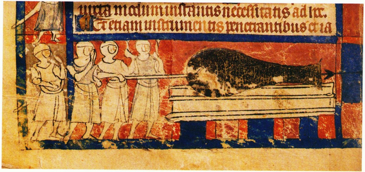 Of course some modification had to be done: the diameter of the arrow haft increased in comparison with bow arrows and crossbow bolts (quarrels), the flights were now made of iron and moved forward on the haft; the rear section had to be wound with a cord binding for a tight fit with the muzzle in order to minimize gas loss, and the bottom of the arrow had to be reinforced by a pinned iron plate, to prevent it from splintering. We do not know whether an additional kind of sabot was used between the powder load and the arrow, e.g. a wooden plug. We should keep in mind though that in the earliest days, black powder was comparatively inefficient due to its recipe, and because it was fine 'meal powder'; hence the barrels probably had to be filled for two thirds to three quarters of their length, with the projectile located near the muzzle! In any case, the flights of a gun arrow had to stay outside the muzzle! Aiming of course was not very effective then but on the other hand, and well up into the 19th century, military tactics were not primarily confined to close aiming but rather concentrated on sending a hailstorm of projectiles into the mass of enemies. The two oldest illustrative sources on gun arrows are illuminated miniatures in manuscripts by de Milemete: the 'Holkham ms': De secretis secretorum, 1326, Bodleian Library Oxford, ms 458, and the 'de Milemete ms': De nobilitatibus, sapientiis, et prudentiis regum, 1326-7, Christ Church Oxford (top attachments). In both depictions we see a vase-like gun (pot de feu), most probably of cast bronze, at the very moment right before the ignition by means of a linstock clamped with a piece of matchcord or tinder, and with an arrow protruding from the muzzle - but not yet leaving it. In the older illustration of the two, a group of people seemingly show great respect to the act of ignition, standing back with their bodies bent backwards; the igniting device seems to be a glowing iron put directly in the touch hole at the rear. In the second illumination, an additional fuse is seen placed in the touch hole, with the gunner's linstock touching it. What nobody seems to have noticed so far: in both miniatures the tip of the arrow head is sharply pointed, and characteristically flared in the older picture. Most important though is the fact that in the second illustration, the thin-pointed arrow head clearly consists of several clasps comprising a glowing incendiary mass. Although this mass is not depicted in the older illustration the flared, fragile shape of the tip suggests that it is definitely not a conventional strong piercing tip but must be an incendiary arrow solely designed to get stuck in straw or wood. Thus the earliest gun arrows actually were incendiary arrows, fired at the roofs of a besieged town - which also makes more sense regarding the poor ballistics of these arrows, due to their heavy heads! A cast-bronze vase-shaped gun barrel very close to those pictured by de Milemete has become famous as the world's oldest known gun, the so-called Loshult gun, and is now preserved in the Statens Historiska Museet Stockholm, inv.-no. 2891 (attachments). It is generally dated ca. 1330-50 and measures 31 cm overall, at a weight of 9.050 kilograms; the bore at the muzzle is 36 mm narrowing down to 31 mm on its way to the rear, which seems ideal for firing arrows featuring a cord binding for a tight fit in the muzzle, to minimize gas loss. After these records of 1326-7, it takes almost one hundred years to find the next-in-line illustration of a gun arrow - at a time when lead and iron projectiles, first appearing as clod shot chopped off a bar, had established themselves long since. After all, the earliest records of clod shot are from the Netherlands, 1375: http://www.vikingsword.com/vb/showth...ight=clod+shot It is also possible that clod shot was used as a sabot for gun arrows. This second-oldest illustration, also depicting a - rather tiny - vase-shaped gun, is from the Streydpuech (Book on War), ca. 1410-30, Kunsthistorisches Museum Vienna, P 5135, fol. 9v (b/w line illustration, next-in-line attachment). What is most remarkable about this illustration is the fact that, for the first time ever, the arrow head is now depicted looking like that of an average crossbow bolt: stout and pointed, obviously designed to pierce metal, and without an incendiary mass! It is only shortly after this instance that the same metal piercing type of gun arrows reoccurs, now fired from two Cerbottana guns, with lead balls (!) used as sabots for the arrows: in a sketchbook by Mariano Taccola, De ingeneis, ca. 1440; Bayerische Staatsbibliothek München, Clm 197, fol. 50r (line drawing, attached). The next chronological instance is in Roberto Valturio, De re militari, 1466, fol. 79v, re-issued many times after. Most remarkably, in his depiction of the arrow head, Valturio has recourse to the earliest design of the incendiary arrows of 1326-7, obviously equiped with four clasps comprising a burning mass! The arrow is fired from a gun forming an integral part of a giant wheeled siege engine, in the shape of a fantastic dragon (color attachment). Only more than a century later we find another illustration, and seemingly the last on this topic, showing a Spanish musketeer of ca. 1570-80 firing an incendiary arrow from his matchlock musket (attachment). In summing up the illustrative sources, it seems that the primary use of gun arrows over the centuries was throwing fire in a parable across town walls by incendiary arrows, the delicate but sharply pointed tips getting stuck in the roofs thatched with straw or wooden shingles, causing an inferno in the narrow-built medieval town. Gun arrows with stout, pointed metal piercing heads not containing an incendiary mass are not recorded before the early 15th c. and, due to their poor ballistics, seem to have seen only very limited service. Now, what about surviving gun arrows? For a couple of years, one of two sensational ex