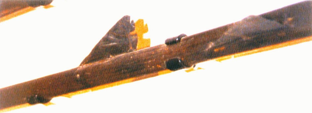 The haft is of silver fir, the flights are oak. At the extreme rear end, right behind the flights, a dark area is visible, most probably the former place of a hemp or cord binding gasket. m Last edited by Matchlock; 10th July 2012 at 07:36 PM. |