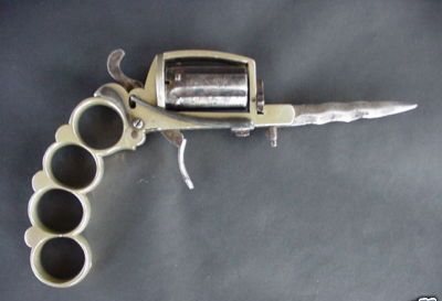 One of the most unique weapons used by these early gang members was the odd combination revolver which was comprised of a small caliber (usually 7mm or .27 cal. pinfire) revolver with the grip replaced with knuckleduster (brass knuckles) and a small bayonet ...all of which folded up for east concealment.
