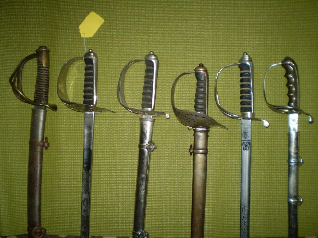 Here are a couple group shots of the hilts of some swords that followed me home over the last couple months. A few I have identified, most I have not.....One is a William Glaze / Palmetto Armory Confederate, one a Prussian Degan, A Japanese Kyu Gunta, one or two British Officers swords, and a Knights Templar Fraternal sword. The bigger basket style are are made by Wilkinson and one by a company called Guthrie & Valentine. PLease comment and help me I.D. the rest !!!