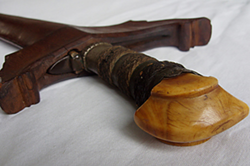 That pin on the crest might not have been a restoration. Maybe it was there at the initial carving of the ivory, pinned the crest for added support, and then the crest broke off with much handling. I have a Kris with a bone kakatua pommel that has pieces of the crest pinned together. I'll post a photo when the sun rises. |