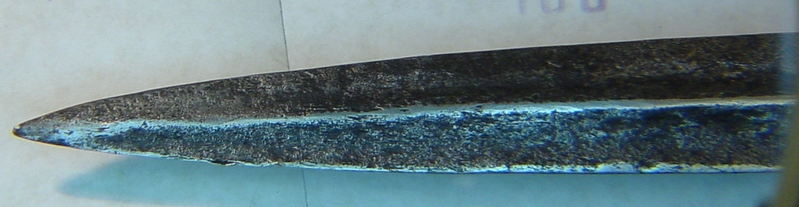 I do not know if these pictures are any better, but shown next to other examples of blade they do help illustrate what I am suggesting. perhaps not acid but a deliberate process to effect the appearance of the blade. Even more so when compared to the rough working of the throwing knife blade.