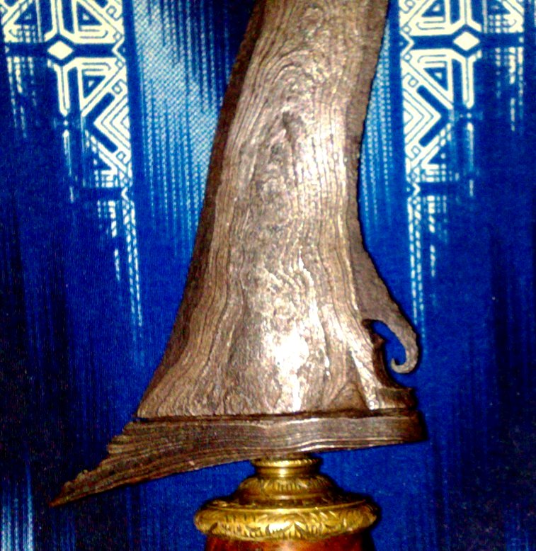 I am OK with any opinion on the matter. It does not detract fme from the fact that I have a wonderful eg of a Malay Bugis variation & of a good vintage here. Please feel free to offer your views.. even a contrarian one. BTW the hilt is fixed unto the blade & as it fits my grip well, I had decided to let it be instead of chancing any damage to that gorgeous hilt should I try to remove it. |
