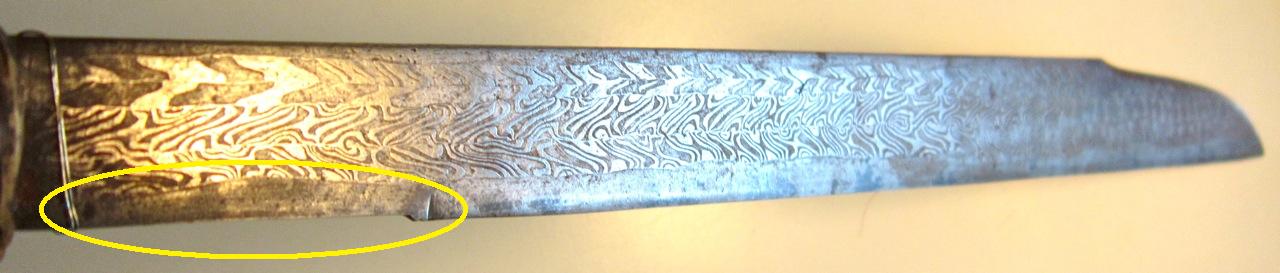 Congratulations on this one Michael. Never have seen something like it. English North Borneo area? I have the feeling the blade had been restyled and got narrower to get it fix in the handle a long, long time ago....(red oval). I also believe to see some old sanding/polishing marks in the lowest twistcore row at that area of the "restyled" shoulder.(yellow oval). But just a guess! I really like it! Kind Regards, Maurice |