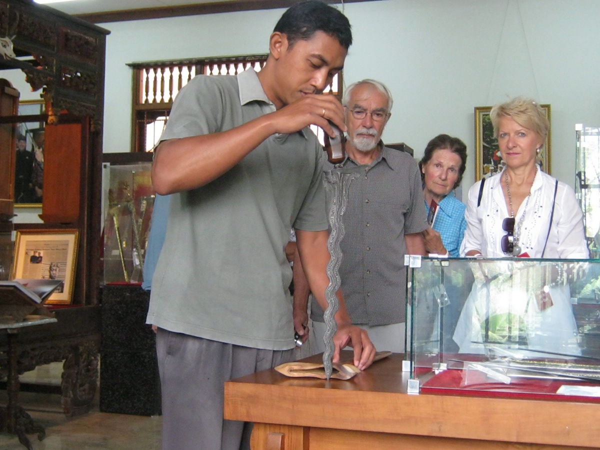 One of the favorite keris in Neka's Keris Museum at Sanggingan, Ubud, Gianyar Bali (more or less 40 km from Kuta) is this Keris Tantri, named "Singa Lembu", a heritage keris from Kerajaan (kingdom) of Gelgel, Klungkung, XV century. It was sold by the heir of Klungkung to a family, Wayan Ringin and Ni Nyoman Tinggen, a keris collector from Sampalan village, Klungkung). Then, two more owner, before owned by Pande Wayan Sutedja Neka (picture) -- the owner of Neka's Art Museum...