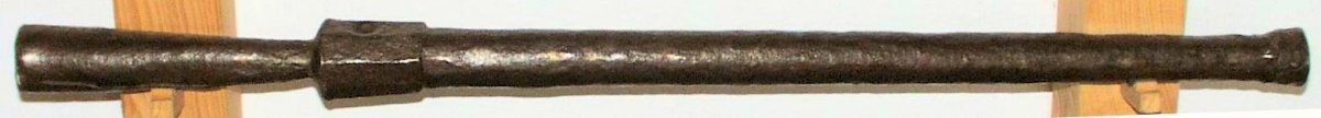 The manufacturing techniques, the short actual barrel length just sufficient to receive a stone ball, the angularly reinforced breech with the big molded touch hole on top and the state of corrosion would all suggest a small stone-ball firing gun (Steinbüchse) of Northern European provenance and an age of ca. 600 years; the catalog description labeled it as 'Chinese, 19th c.' though.