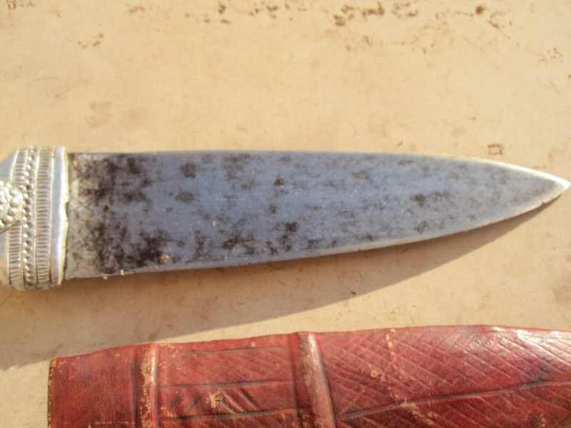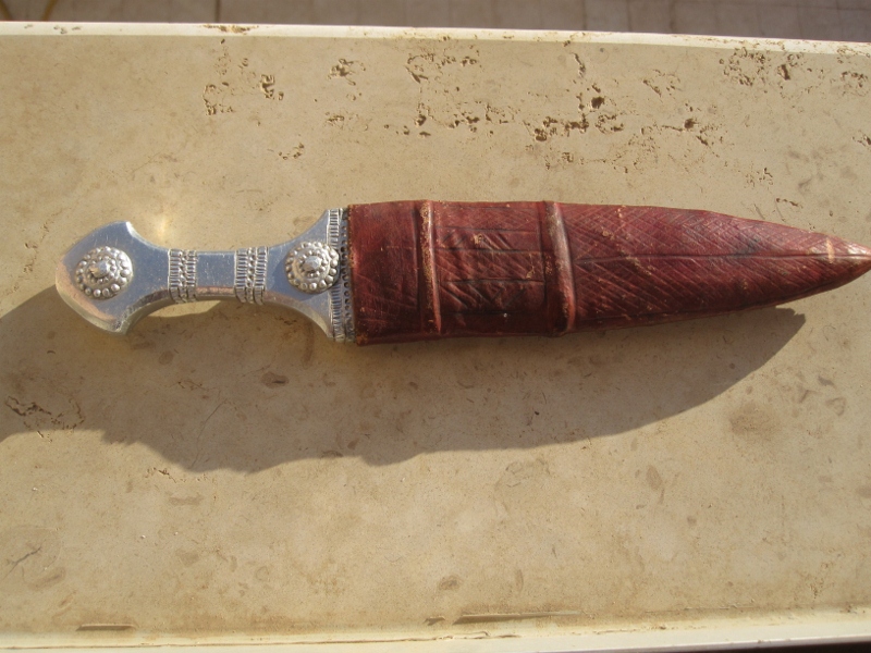 Up for sale is a very interesting Jambiya that comes with a straight blade. The hilt is aluminium nicely decorated and the blade is a nice forged one with alittle black rust and some pitting that would clean up nicely. Scabbard is leather over wood in excellent condition. Its not a big piece standing alittle over 10 inches.