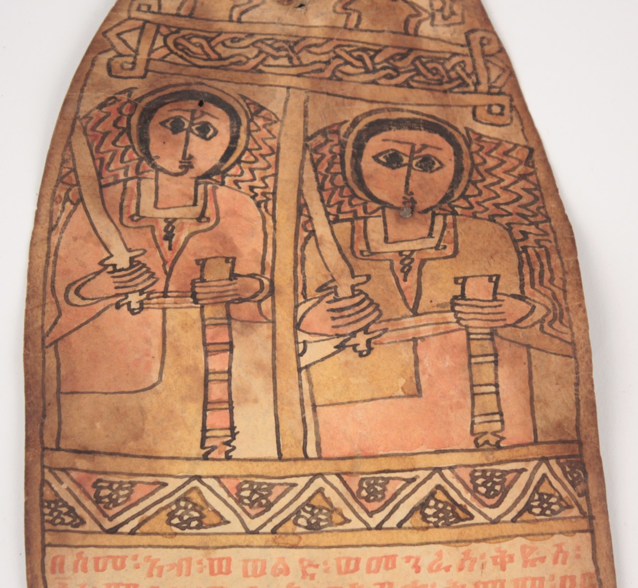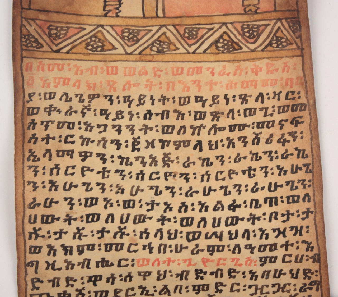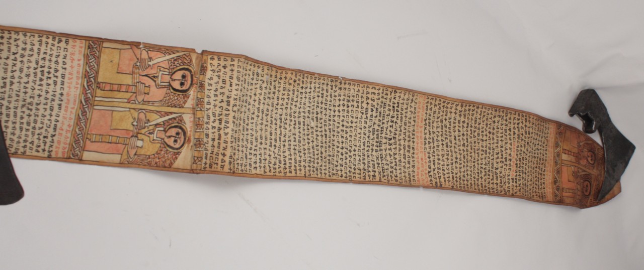 This is a 19th-20th century Ethiopian “magic scroll.” It is on parchment, probably goatskin, and in the language of Ge’ez (pronounced guh-UHZ, sometimes known as Ethiopic). It’s about 72 inches long and 4.5" wide.