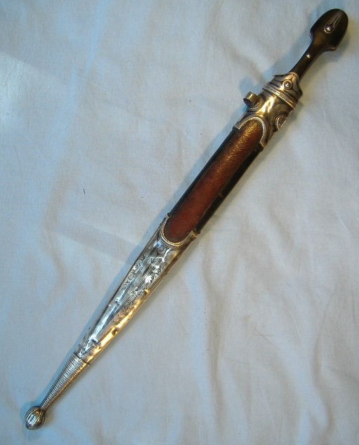 I am hoping one of our Arabic speakers will be kind enough to translate the inscription on the rear of the chape of this kindjal.