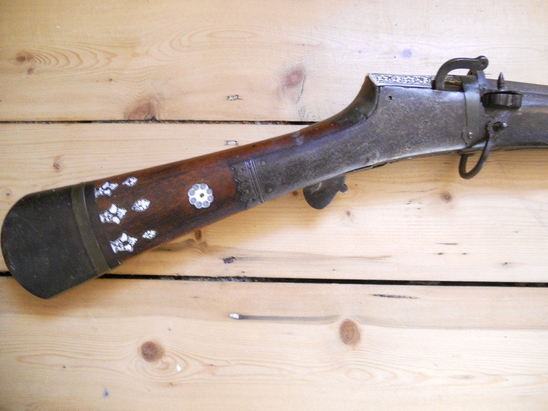 Can any members help me place the origin and age of this matchlock please . I rather like the look of it and have just swopped it for German bayonet so it seemed a good deal to me. It is 1.5 m long and has a hexagonal barrel with a bore of 0.5 inches . I can see no markings except for the deeply impressed shield shaped stamp illustrated. There is a peephole rearsight and a blade foresight . To me it seems of very good quality but I await more expert opions than mine. Thank you.