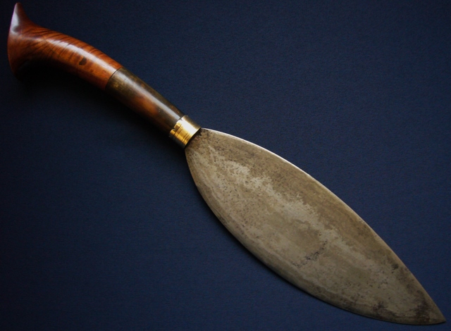 I was looking for such old style barung for a long time. And suddenly two of them popped up, but I only got this one unfortunately! Features: The scabbard is very broad, but in very good condition. The cacatua pommel is also made of a very nice wood. Unfortunately a part of the beak and the crest had been broken off a long time ago, cause the breaks have a lot of patina on it. The sleeve is made of horn, something I have never seen on a barung (I think there are a few in the Leiden museum with a horn sleeve, but it is hard to see on the database images). The horn has a big crack, but happily still there. The blade was very dirty. I decided just to clean it a little of the worst dirt and rust, and than give it a slight etch with vinegar. During etching a hardened edge popped up and also some lamination on the blade. Any input/suggestions of which region it could derive? Maurice |