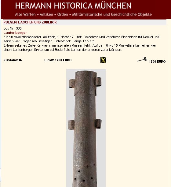 It is made of thin tinned and brazed iron with a cap and four rings for a suspension cord. In its lower section and in the bottom there are a few irregular holes for ventilation and a thick piece of hemp matchcord is preserved inside. The overall length of the piece is 17 cm. Match hiders are recorded to have been carried by only one musketeer out of a group of 15 or 20 in order to enable the others to light their matches in case of emergency. As smoldering match would not only produce a visible glow and smoke but a traitorous smell as well, match hiders are believed to have been used especially on night marches. The item in discussion was sold Hermann Historica, Munich, on October 5, 2009, at a hammer price of 1,700 euro. In addition to images of this rarissimum, I enclose a few photos of similar match hiders on late 16th century Saxon bandoliers that I photographed in museums over decades. Best, Michael Last edited by Matchlock; 7th October 2009 at 04:18 PM. |