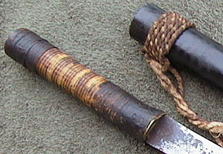 I hesitated to make a comparison, but the only daab I have handled with this kind of a handle wrap is one of my own which was one made with a uniformly (more-or-less) thick blade, such as you would see in a nihon-to. My blade was clearly home-made and by someone who was not very well-informed about how one should be made -- a bad e-bay purchase . The uniformly-thick blade makes it very tip-heavy, which is not correct for a daab (the POB on a dha/daab should be just a few inches in front of the grip). It also has the plate attached with four nails. So, I am glad that Ian has seen others with this kind of wrapping which are "legitimate." ![]() PS: I think the black wrapping on the grip is cord, not rattan, since it is twisted rather than braided. |