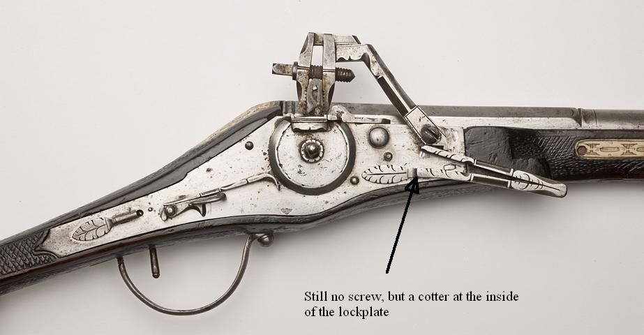 The pistol differs from later examples as a sign of early make in two details: The spring of the cock is still not fixed by a screw to the lockplate but by a cotter at the inside of the plate. The trigger mechanism with a long lever turning around a screw and moved by the trigger is totaly different to later examples.
