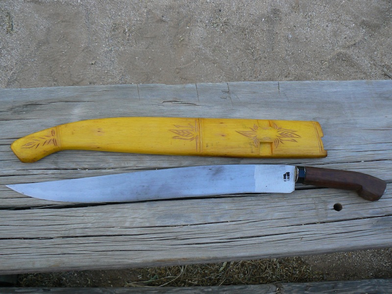 "These photos are of a Dahong Palay (rice leaf) from the town of Tabaco, in Bicol, Philippines. The blade is 17" and the "tabak" was made this year. The scabbard is tied with mono filament fishing line instead of cordage. Thickness of the spine at the handle is 4.5 mm. The short sword weighs 16 oz."