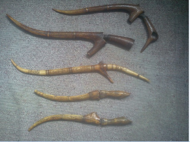 I bought these knives some years back which are supposed to be from the Batak tribes of Sumatera. The blades are plain but the scabbards were decorated quite nicely and made of deer antler.