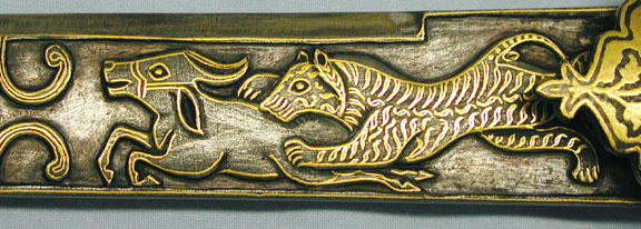 The decorative motif depicting various animals on the blade is termed 'shikargaha' in India, and seems to derive from Persian craftsmanship in such motif. It is generally presumed that these decorative blades are typically found on blades of 'hunting' swords, as the figures of animals in varying action situations suggest. There are examples with wider range of figures including one with a tiger attacking a mahout (elephant driver), a tiger attacking a horseman, some even with a horseman pursuing a foot soldier.