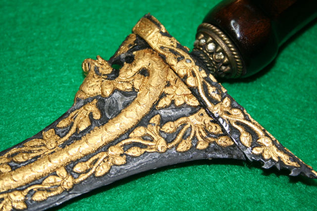 Thank you! That helps me a great deal. I like it also and am reasonably certain the gilding is gold. My fingernail has no effect on it and the blade is heavier than the other three Keris I have, which I attribute to the gold. I would not have been a bit surprised to discover it was a tourist item, and am thrilled that it is not. I'll swap out the hilt for the more traditional one and park the one from Madura on my desk. Thanks again. Much appreciated.