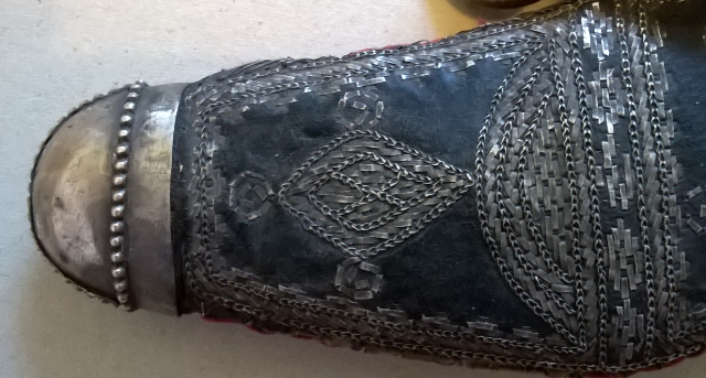 I would also like to know, if possible where it originated, is it Omani? Do the symbols or patterns in the silver chain stitching have a particular meaning? Do the roundels deliberately mimic the Omani or Zanzibar shield perhaps? Or something else?