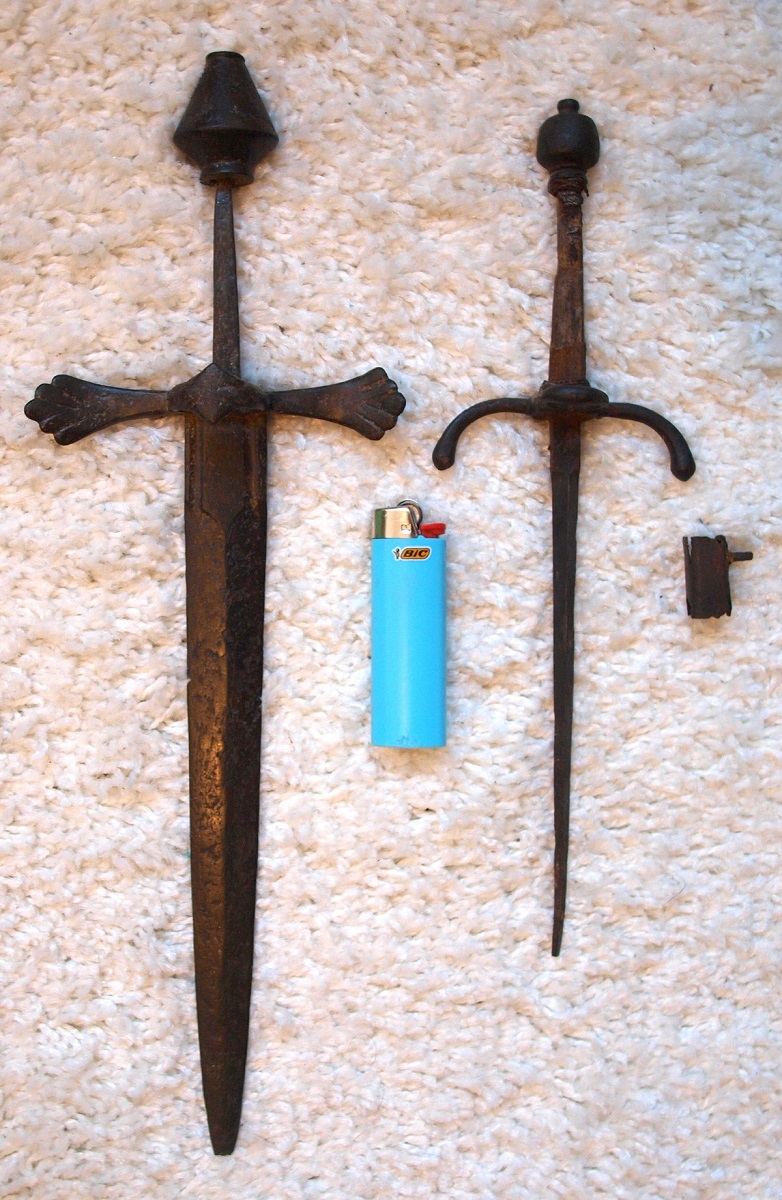 I got this estate of an diver. Should be lake findings. The most interesting piece in my eyes is the small (lefthand?-) dagger (~30cm overall length). Please see the comparison to another dagger from the 16th century and a lighter. Is it possible that it was made for kids? The single dagger blade is also a very fine peace. Is it around 1600? Would be great to get more information about all the pieces, especially the dagger and blade, but also the age of the cutlery would be interesting. Kinf regards Andreas Last edited by AHorsa; 17th March 2016 at 11:48 PM. |