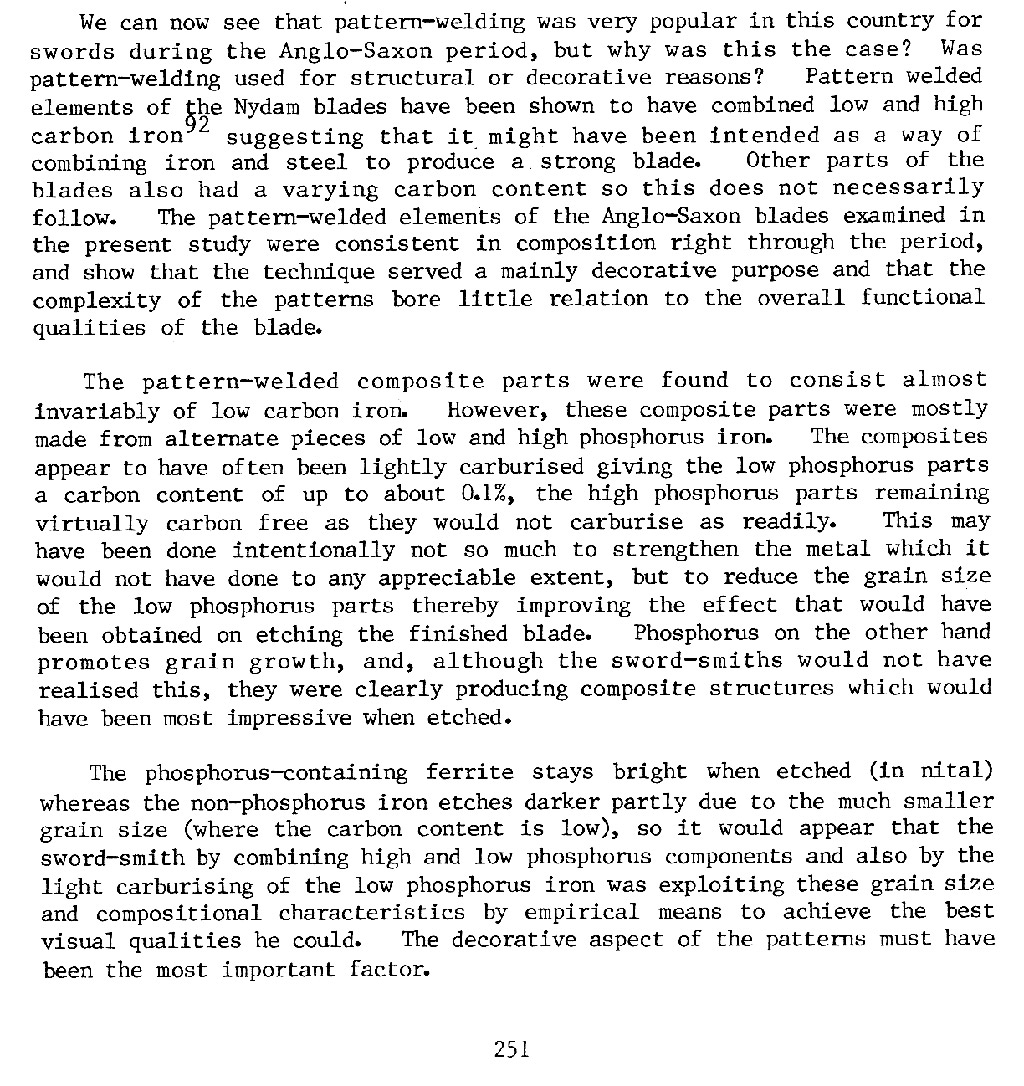 Tylecote, R.F. and Gilmour, B.J.J., B.A.R.British Series 155: The Metallography of Early Ferrous Edge Tools and Edged Weapons (Oxford: B.A.R., 1986). A relevant selection from page 251 of that work is shown below. Page 252 is table (ex. Salin) on composition of Merovingian pattern-welded sword blades and gives Phosphorous contents between 0.14 and 0.35% but without localization. |