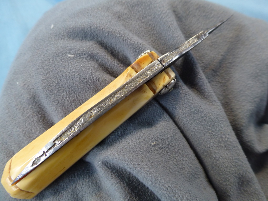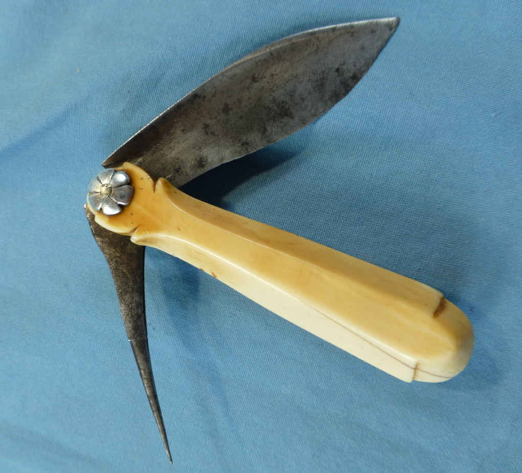 "The origin and use of this type of folding knives is not very clear and there are numerous suggestions ranging from knives to clean opium pipes to knives for cutting and inscribing on palm leaves. The origin is most probably from the Indo-China area. It has a 3 inches blade, hollow ground, 2 1/2 inches back spike with silver plated strip o the spine. Ivory handle. 6 inches fully opened. Very good condition." Any other insights/comments |