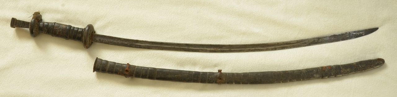 today I have this recently won African saber. I think it comes from North Africa, until now my researches are fruitless. The blade looks european but it is very sure a local production, obviously inspired by an european saber. The ~70cm long blade is thin, flexible and very light. I cannot see any signs of lamination. The construction of the scabbard is interesting, it has a wooden core, a thick layer of textiles and a cover made from leather. The piece seems to be very old, the scabbard including its wooden core is flexible like rubber. The hilt is also filled with textiles and covered with leather. At the end of the blade is a long pommel or hammer. The hammer/pommel was made from iron (almost non-magnetic) and was once completely covered with yellow metal, probably brass. I'm unsure what I got and whether it is worth a restoration. Some tips what I could do with the lost leather at the hilt would be very useful. The blade has some remains of a bumbling restoration attempt with a Dremel or something like that. Thats a good reason for me to polish the blade back to ist original Beauty, because it was once finished very carefully, the surface is almost flat like a mirror. Best wishes, Roland |
