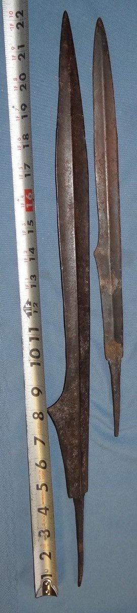 I recently won these two spearheads on eBay. While I am sure I have seen similarly shaped spears in the past, I can find nothing in my notes or any of my references. Does anyone have an idea where these spearheads may have originated from.
