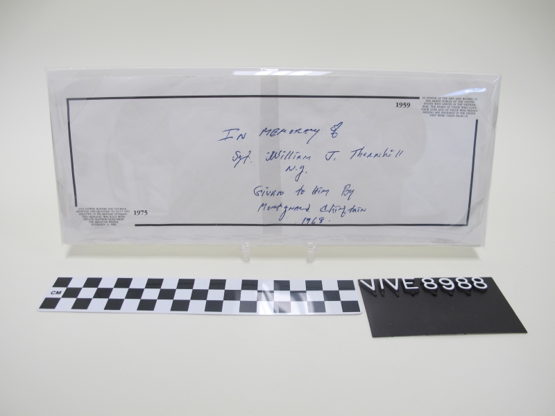 Note reads: “In memory of Sgt. William J. Thornhill N.Y. Given to Him by Montagnard Chieftain 1968”
