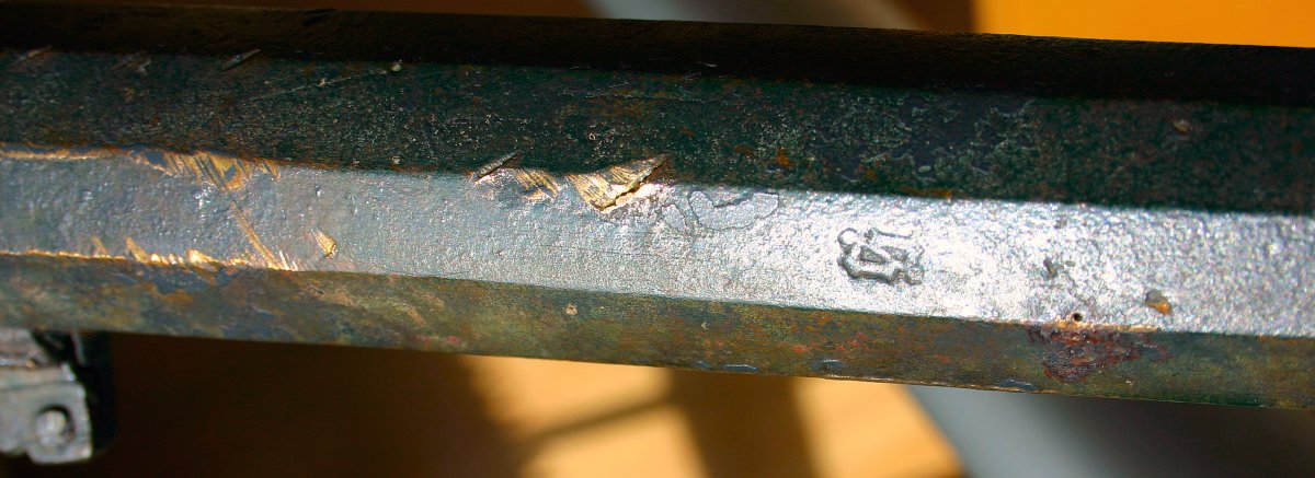 Octagonal throughout, the swamped rear end with integral back sight, the breech section struck with an indistinct mark, possibly a Gothic majuscule or minuscule letter, the short octagonal reinforced muzzle section with integral blade fore sight. The right-hand side priming pan retaining its riveted swiveling cover. Two quadral loops for stock pins on the underside.