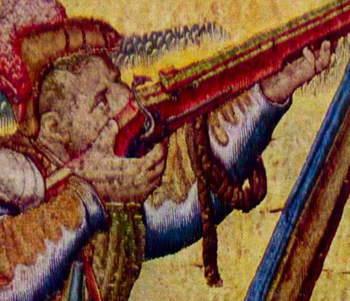 - in Theuerdank (printed in 1517), the Emperor Maximilian I is depicted aiming a similar but shorter type of arquebus also mounted with a brass barrel;