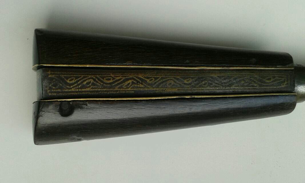 Wootz blade,faint pattern.Brass and horn hilt.Scabbard leather over wooden core.Very good condition.Scabbard missing the ivory knob from the end.It was loose and went missing.I'll find it or make a replacement of ivory if wished. Price 245€.including shipping. ON HOLD. Last edited by Blacksmith; 18th April 2018 at 07:47 PM. |