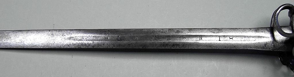 Spot on Cap'n! Scottish hilts had the open furrow or ring around the pommel where the arms of the guard joined, while English typically used screws. Also, the English hilts were more 'workman' like without the pierced designs, which were often regarded as Jacobite symbols though there is no clear definition of what these were specifically. The 'ram horns' ( a term only used by Mazansky as far as most regard) would not be on an English hilt. As you have noted, 'Scottish' designed hilts were still produced in the 'garrison' towns post Rebellion (after 1746) Primarily Glasgow and by Scottish hammermen for the forces of Scottish units now in the British army. Regiments such as the Royal Scots Greys still used Scottish style hilts, while others used the less Scottish styles with plain plates and there were the types for Black Watch made in Birmingham. The brisk trade of importing blades from Solingen remained key through the 18th century,and many of the blades remained in circulation for many years. As far as I have known on the inscription on the blade here, it may be a corruption or cognate of Latin ' in mind', but cannot recall the exact details. It seems like German piecing of a phrase. As always, I would defer to the real experts here on these, Eljay and Cathey! |