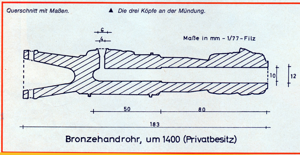 The supposed date of ca. 1430 is backed up further by the small touchhole with its slightly deepened, rudimentary pan molding. While the Mörkö gun, as well as the double barrel sample, has a small trough with a raised brim around the touchhole, the latter here is formed as the mouth of a distorted human face.