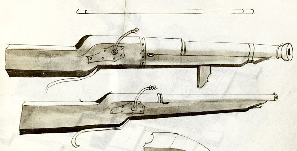 Two matchlock arquebuses simillar to the drawing by Martin Merz, from the Ingenieurskunst- und Wunderbuch (Book on Engineering and Miracles), Weimar, ca. 1520's, fol. 196r.